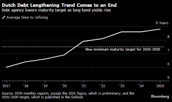 Het Nederlandse agentschap van het ministerie van Financiën, aangeduid als de Dutch State Treasury Agency (DSTA), anticipeert al langer actief op de komende pensioenstelseltransitie en laat dit duidelijk terugkomen in haar uitgifteagenda voor 2026. Net als veel andere landen kiest Nederland ervoor het lange eind meer te mijden en het aantal 30-jaars uitgiftes zoveel mogelijk te beperken. De focus verschuift daarmee naar staatsobligaties met een lagere gemiddelde duratie, wat past bij de veranderende marktvraag. De verwachting is dat pensioenfondsen door de transitie minder behoefte zullen hebben aan zeer langlopende obligaties voor de renteafdekking. Door nu al geleidelijk bij te sturen, voorkomt het DSTA een abrupte aanpassing later en speelt het in op een structureel veranderend vraagpatroon.