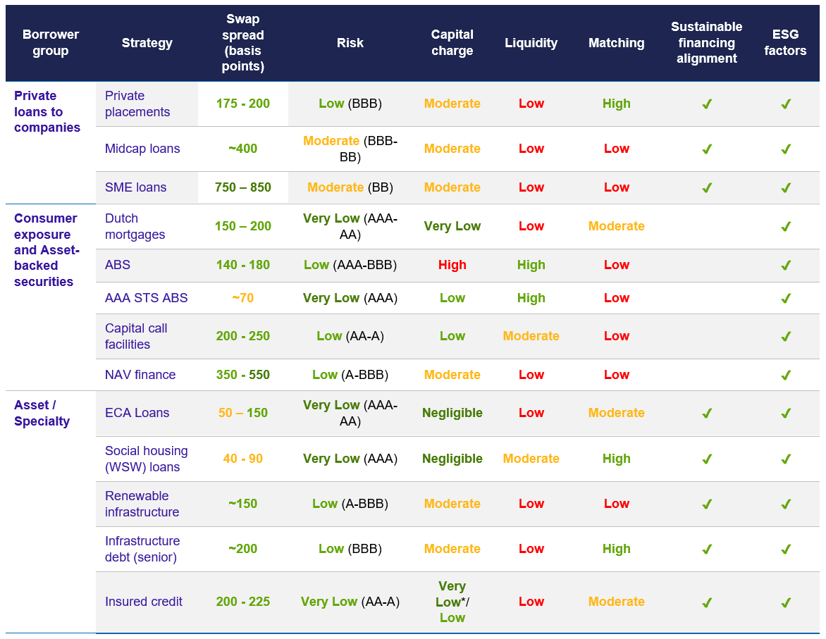 • Alternative fixed income strategies thus show a great variety in terms of spread, risk, capital charge, liquidity, duration matching and opportunities for responsible investing. This enables investors to choose those assets which best fit their particular investment needs, by taking the different characteristics of these assets into account.